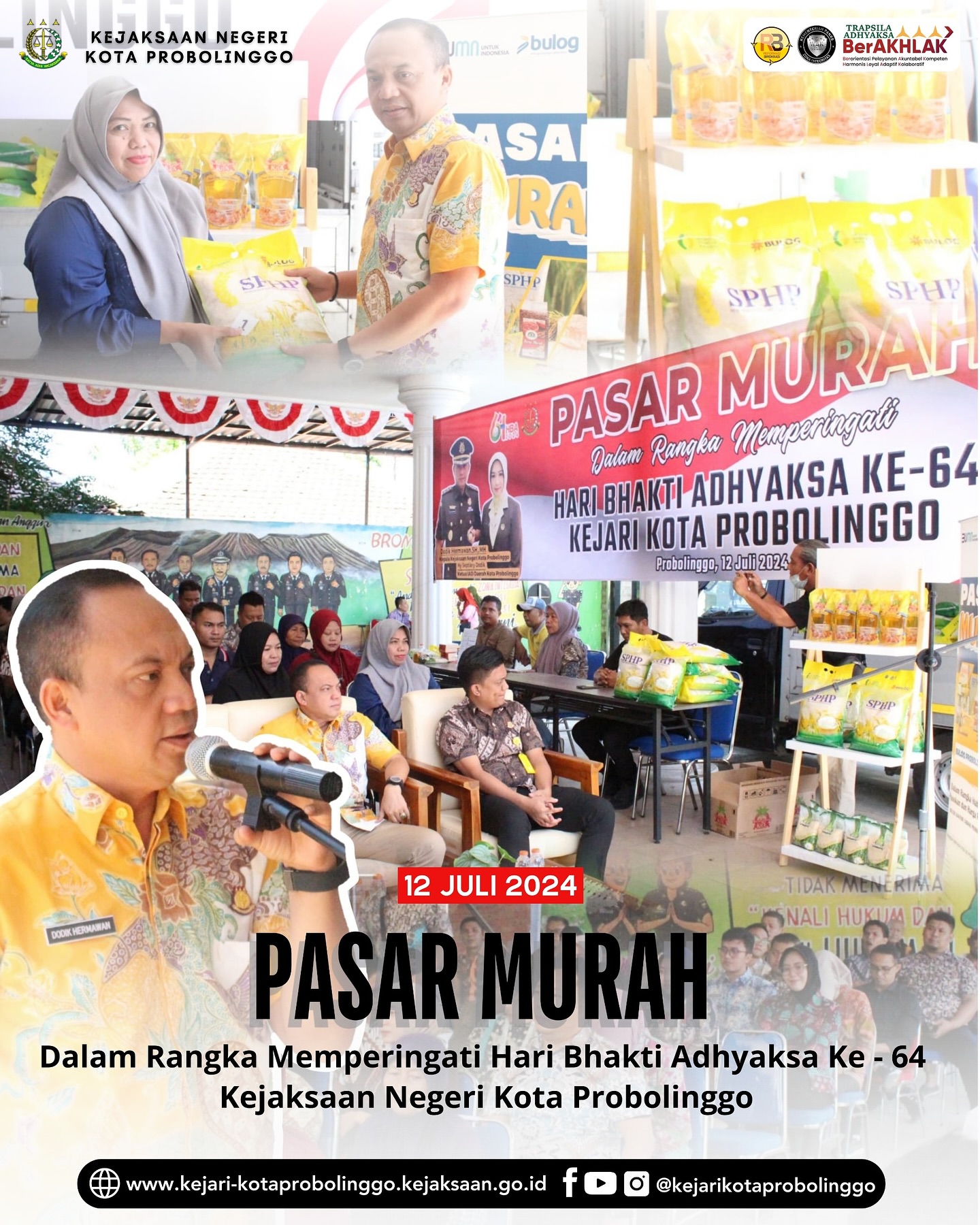 Bahwa pada hari Jumat tanggal 12 Juli 2024 pukul 09.00 wib bertempat di Halaman Kantor Kejaksaan Negeri Kota Probolinggo, Dodik Hermawan, SH.,MH Kepala Kejaksaan Negeri Kota Probolinggo melakukan Pembukaan Kegiatan Sosial Pasar Murah di Halaman Kantor Kejaksaan Negeri Kota Probolinggo yang bekerjasama dengan Bulog Probolinggo. Dalam sambutannya Dodik Hermawan, S.H.,M.H. Kepala Kejaksaan Negeri Kota Probolinggo Kegiatan Sosial Pembukaan Pasar Murah yang bekerjasama dengan Bulog Probolinggo di Kantor Kejaksaan Negeri Kota Probolinggo merupakan Rangkaian Kegiatan Hari Bhakti Adhyaksa Ke 64 serta dengan diselenggarakan Pasar Murah ini sebagai bagian dari upaya menjaga stabilitas harga barang kebutuhan pokok dan barang penting, selain itu untuk membantu meringankan beban masyarakat dalam rangka memperoleh barang kebutuhan pokok yang murah dan terjangkau.