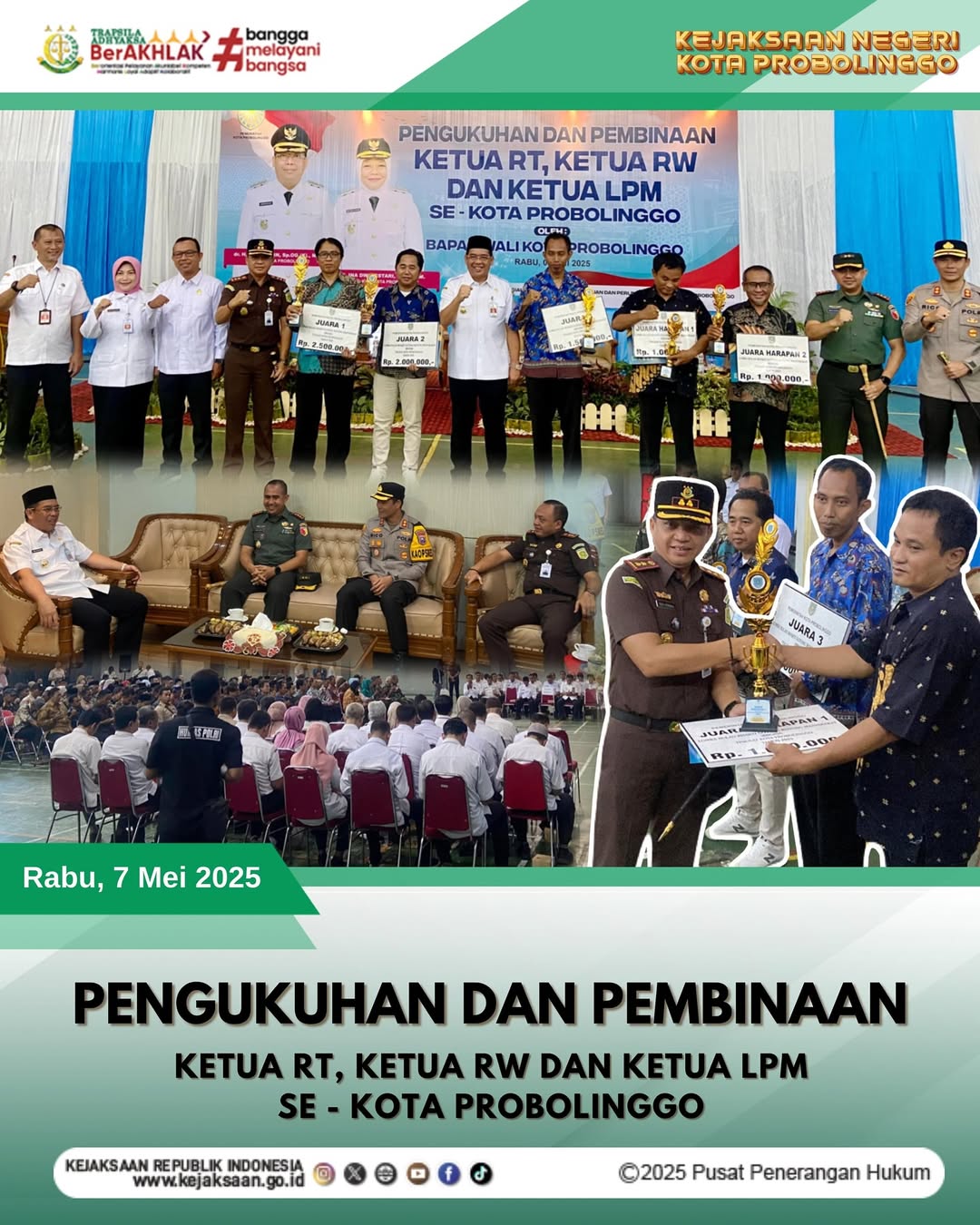 Pada hari Rabu, tanggal 7 Mei 2025, pukul 09.00 WIB s/d selesai, bertempat di GOR Mastrip Kota Probolinggo, Dodik Hermawan, S.H,. M.H. Kepala Kejaksaan Negeri Kota Probolinggo telah melaksanakan kegiatan Pengukuhan dan Pembinaan Ketua RT, Ketua RW dan Ketua LPM Se – Kota Probolinggo.