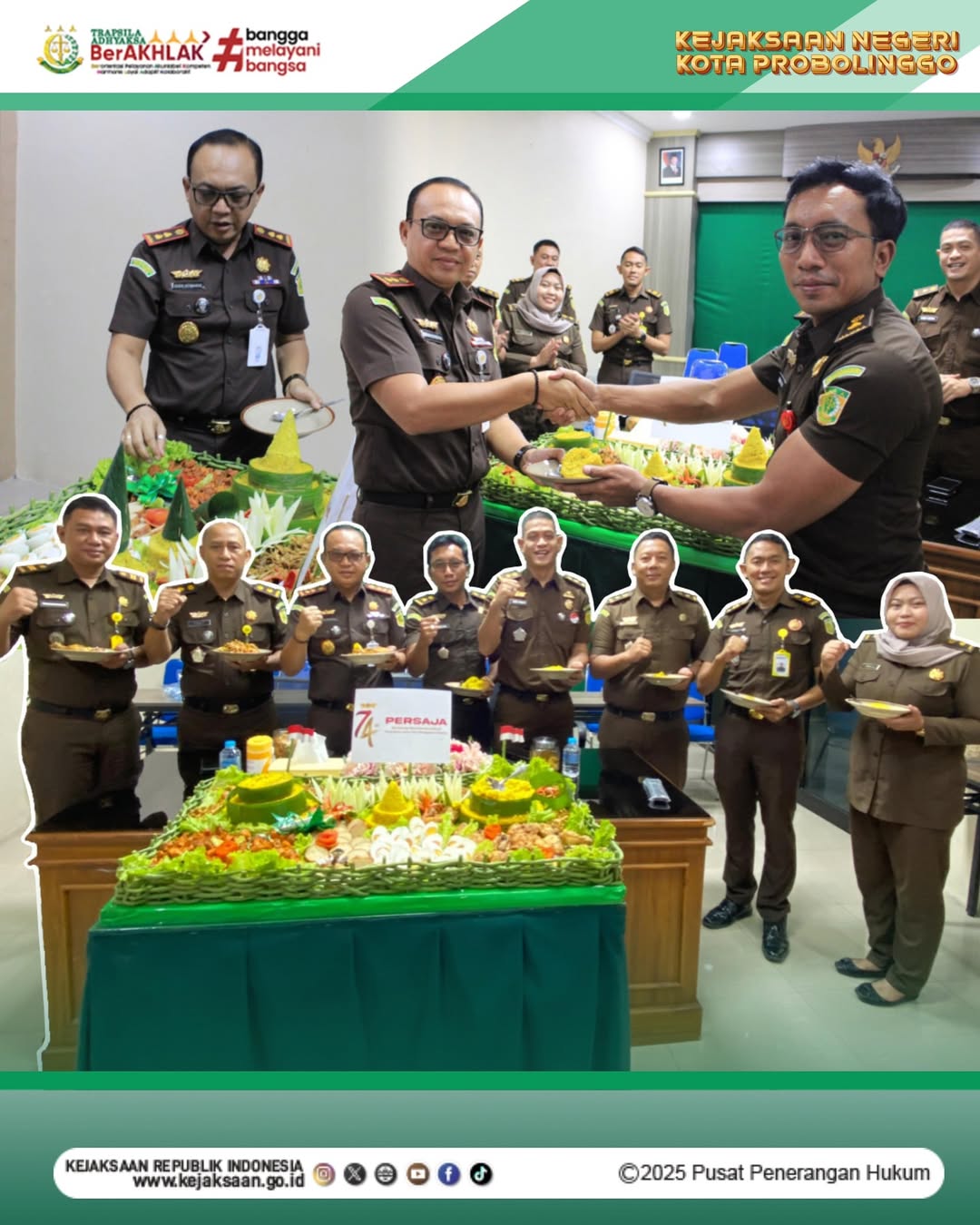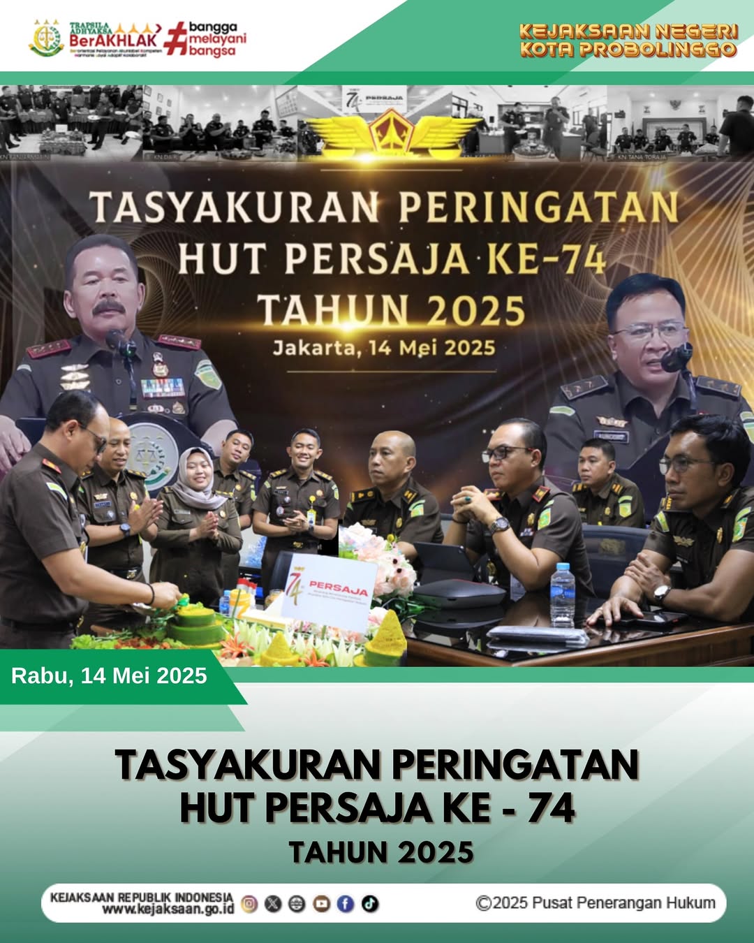 Pada hari Rabu tanggal 14 Mei 2025, pukul 09.30 WIB s/d selesai, bertempat di Ruang Vicon Kantor Kejaksaan Negeri Kota Probolinggo, Dodik Hermawan, S.H., M.H. Kepala Kejaksaan Negeri Kota Probolinggo beserta para Kasi dan Pegawai Kejaksaan Negeri Kota Probolinggo telah melaksanakan kegiatan Tasyakuran Peringatan HUT PERSAJA Ke – 74 Tahun 2025 dengan tema “Bersinergi Mendukung Institusi Wujudkan Asta Cita Penegakan Hukum” secara online melalui zoom meeting dan dilanjutkan dengan pemotongan tumpeng.