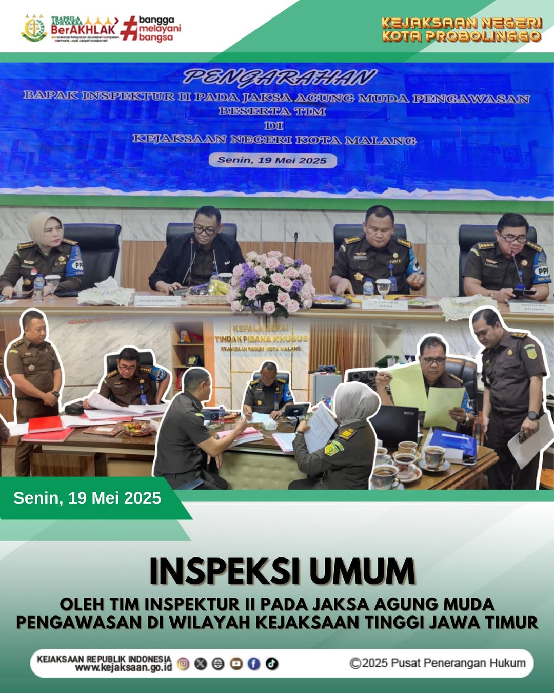 Pada hari Senin tanggal 19 Mei 2025, bertempat di Kejaksaan Negeri Kota Malang, Dodik Hermawan, S.H., M.H. Kepala Kejaksaan Negeri Kota Probolinggo, seluruh Kasi beserta Staff telah melaksanakan kegiatan Inspeksi umum oleh Tim Inspektur Il Pada Jaksa Agung Muda Pengawasan di Wilayah Kejaksaan Tinggi Jawa Timur yang diikuti oleh beberapa satuan kerja Kejaksaan Negeri antara lain :