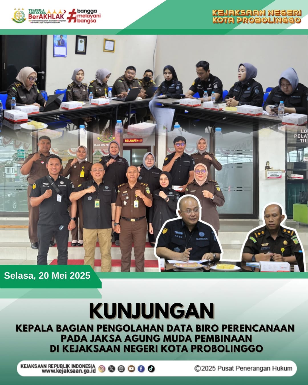 Pada hari Selasa tanggal 20 Mei 2025, pukul 14.20 WIB s/d selesai, bertempat di Kantor Kejaksaan Negeri Kota Probolinggo, Dodik Hermawan, S.H., M.H. Kepala Kejaksaan Negeri Kota Probolinggo yang dalam hal ini diwakili oleh para Kasi pada Kejaksaan Negeri Kota Probolinggo telah menerima Kunjungan Kepala Bagian Pengolahan Data Biro Perencanaan Pada Jaksa Agung Muda Pembinaan.