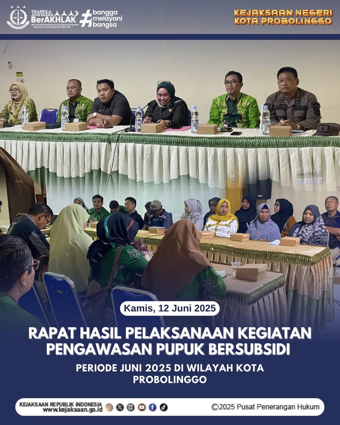 Pada hari Kamis, tanggal 12 Juni 2025, pukul 09.00 s/d 10.00 WIB, bertempat di Aula Dinas Koperasi, UKM dan Perdagangan Kota Probolinggo, Jalan Mastrip Nomor 15 Kota Probolinggo, Dodik Hermawan, S.H,. M.H. Kepala Kejaksaan Negeri Kota Probolinggo yang dalam hal ini diwakili oleh staff Intelijen Kejaksaan Negeri Kota Probolinggo telah melaksanakan Rapat Hasil Pelaksaan Kegiatan Pengawasan Pupuk Bersubsidi Periode Juni 2025 Di Wilayah Kota Probolinggo.
