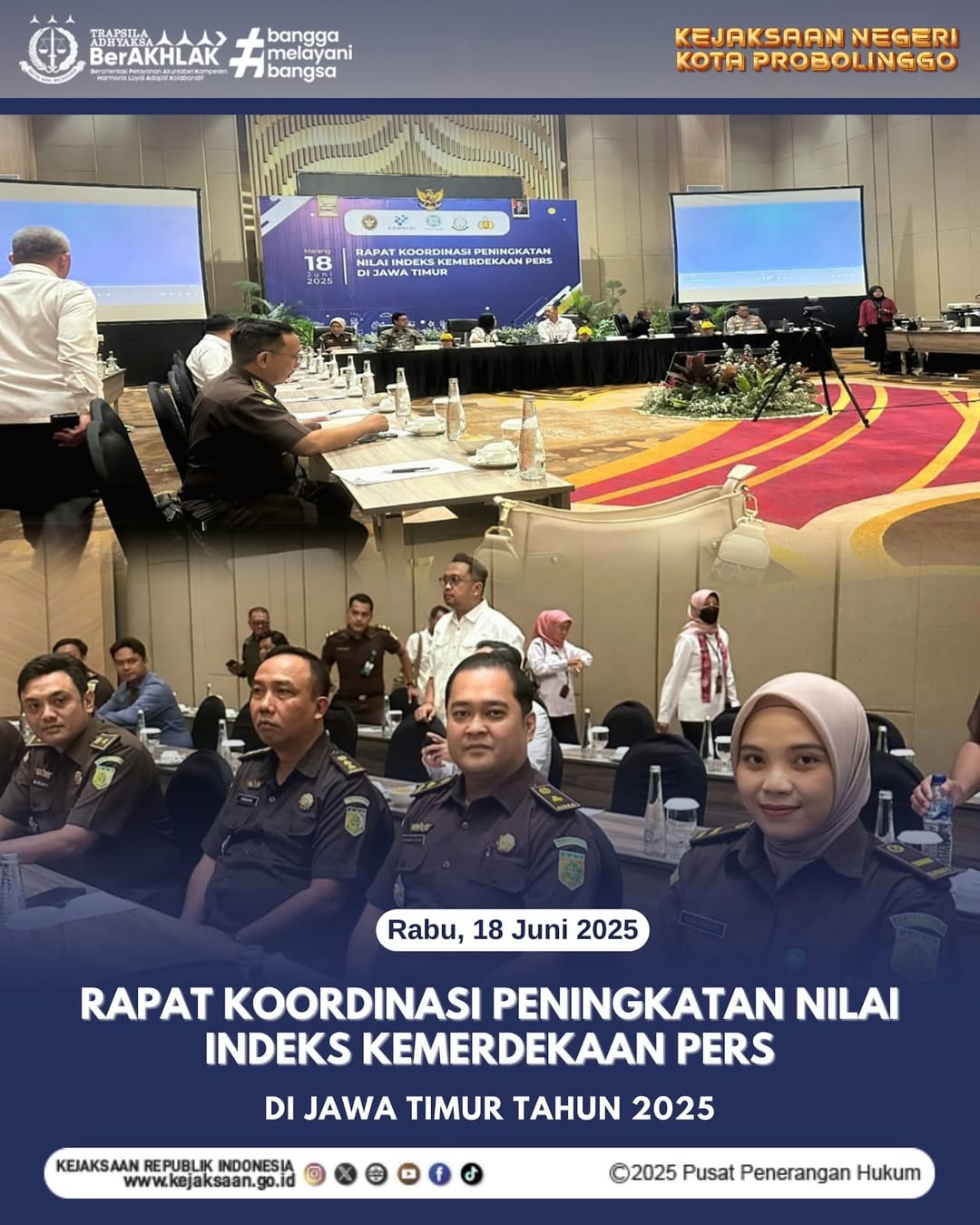 Pada hari Rabu tanggal 18 Juni 2025, pukul 09.30 WIB s/d selesai, bertempat di Grand Mercure Malang Mirama, Jalan Raden Panji Suroso Nomor 7, Malang, Jawa Timur, Dodik Hermawan, S.H,. M.H. Kepala Kejaksaan Negeri Kota Probolinggo yang dalam hal ini diwakili oleh Herdiawan Prayudhi, S.H. Kepala Seksi Intelijen Kejaksaan Negeri Kota Probolinggo telah melaksanakan Rapat Koordinasi Peningkatan Nilai Indeks Kemerdekaan Pers di Jawa Timur.