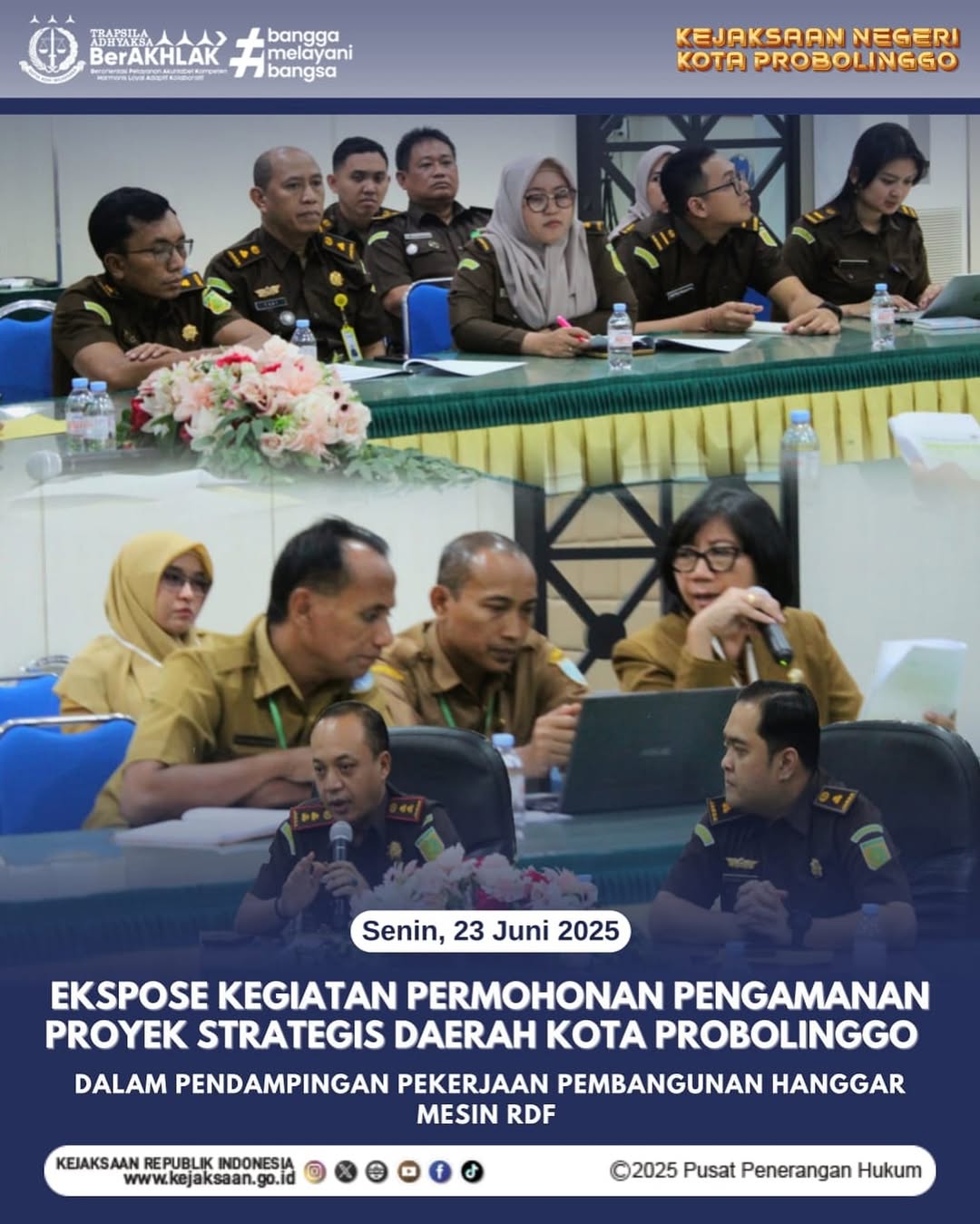Pada hari Senin tanggal 23 Juni 2025, pukul 13.30 WIB s/d 15.00 WIB, bertempat di Aula Kejaksaan Negeri Kota Probolinggo, Dodik Hermawan, S.H., M.H. Kepala Kejaksaan Negeri Kota Probolinggo yang dalam hal ini didampingi oleh Herdiawan Prayudhi, S.H. Kepala Seksi Intelijen Kejaksaan Negeri Kota Probolinggo telah melaksanakan Ekspose Kegiatan Permohonan Pengamanan Proyek Strategis Daerah Kota Probolinggo Dalam Pendampingan Pekerjaan Pembangunan Hanggar Mesin RDF.
