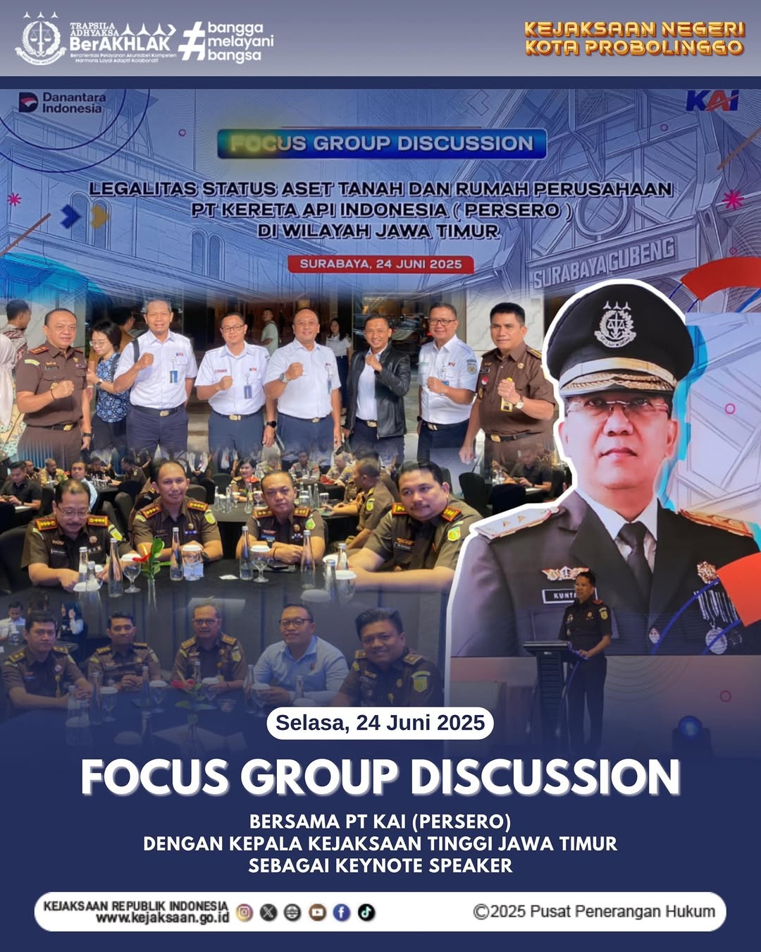 Pada hari Selasa tanggal 24 Juni 2025 pukul 08.00 WIB s/d selesai, bertempat di Hotel Double Tree by Hilton Surabaya, Jl. Tunjungan No. 12, Kecamatan Genteng, Kota Surabaya, Jawa Timur, Dodik Hermawan, S.H., M.H. Kepala Kejaksaan Negeri Kota Probolinggo beserta Andi Haeruddin Malik, S.H., M.H. Kepala Seksi Perdata dan Tata Usaha Negara Kejaksaan Negeri Kota Probolinggo telah mengikuti kegiatan Focus Group Discussion (FGD) bersama PT KAI (Persero) dengan Kepala Kejaksaan Tinggi Jawa Timur sebagai Keynote Speaker dengan tema “Legalitas Status Aset Tanah dan Rumah Perusahaan PT KAI (Persero) Di Wilayah Jawa Timur”.
