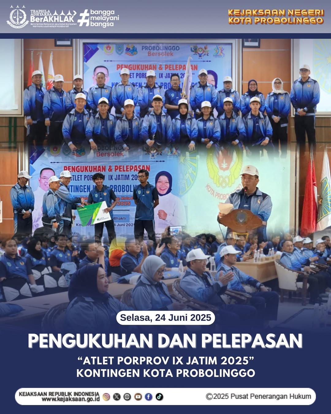 Pada hari Selasa tanggal 24 Juni 2025, pukul 19.00 WIB s/d selesai, bertempat di Gedung Puri Manggala Bhakti, Pemerintah Kota Probolinggo, Dodik Hermawan, S.H., M.H. Kepala Kejaksaan Negeri Kota Probolinggo yang dalam hal ini diwakili oleh Staf Intelijen Kejaksaan Negeri Kota Probolinggo telah mengikuti kegiatan Pengukuhan dan Pelepasan “Atlet Porprov IX Jatim 2025” Kontingen Kota Probolinggo.