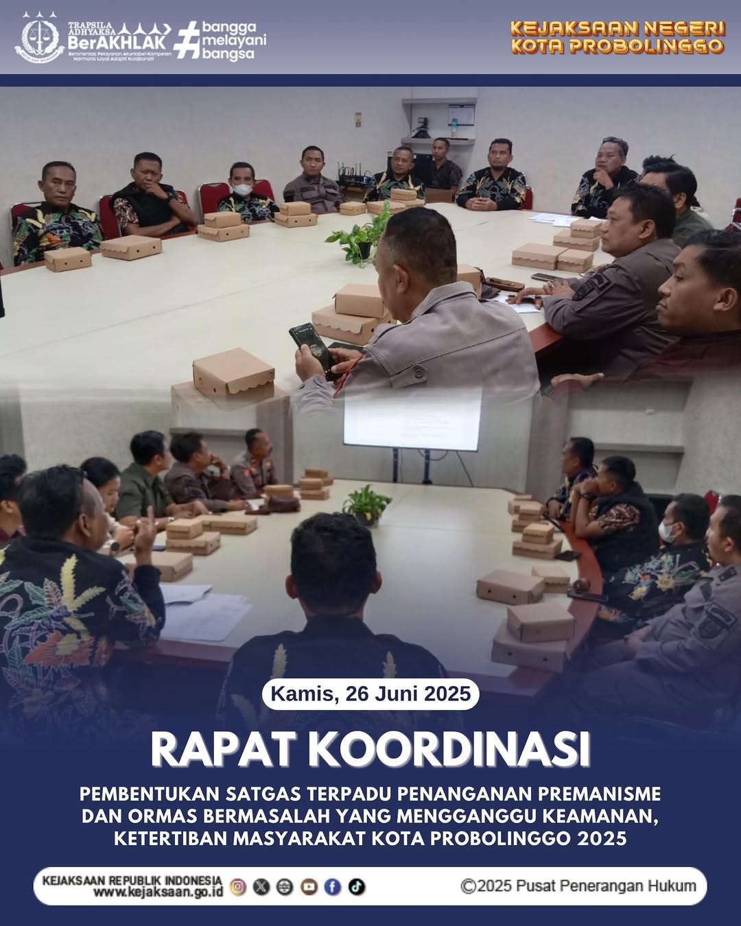 Pada hari Kamis tanggal 26 Juni 2025, pukul 09.00 WIB s/d selesai bertempat di Ruang Pertemuan Bakesbangpol, Jl. Mawar No. 39 A Kota Probolinggo, Dodik Hermawan, S.H., M.H. Kepala Kejaksaan Negeri Kota Probolinggo yang dalam hal ini diwakili oleh Staff Intelijen Kejaksaan Negeri Kota Probolinggo telah mengikuti kegiatan Rapat Koordinasi Pembentukan Satgas Terpadu Penanganan Premanisme dan Ormas Bermasalah yang Mengganggu Keamanan, Ketertiban Masyarakat Kota Probolinggo 2025.