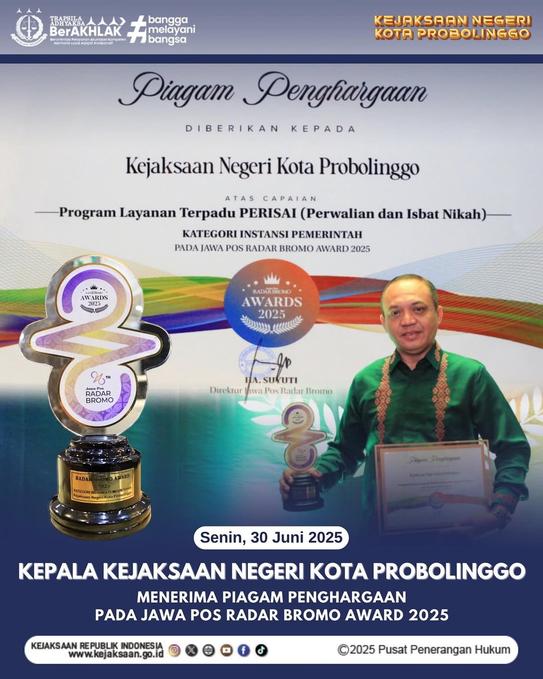 KEPALA KEJAKSAAN NEGERI KOTA PROBOLINGGO MENERIMA PIAGAM PENGHARGAAN PADA JAWA POS RADAR BROMO AWARD 2025