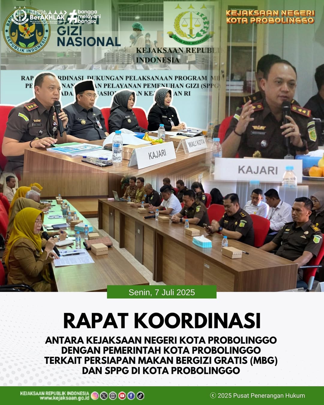 Pada hari Senin tanggal 7 Juli 2025, pukul 08.30 WIB s/d selesai, bertempat di Ruang Rapat Nawasena Pemerintah Kota Probolinggo, Dodik Hermawan, S.H., M.H. Kepala Kejaksaan Negeri Kota Probolinggo beserta seluruh Kasi pada Kejaksaan Negeri Kota Probolinggo telah mengikuti kegiatan Rapat Koordinasi Antara Kejaksaan Negeri Kota Probolinggo dengan Pemerintah Kota Probolinggo Terkait Persiapan Makan Bergizi Gratis (MBG) dan SPPG di Kota Probolinggo.