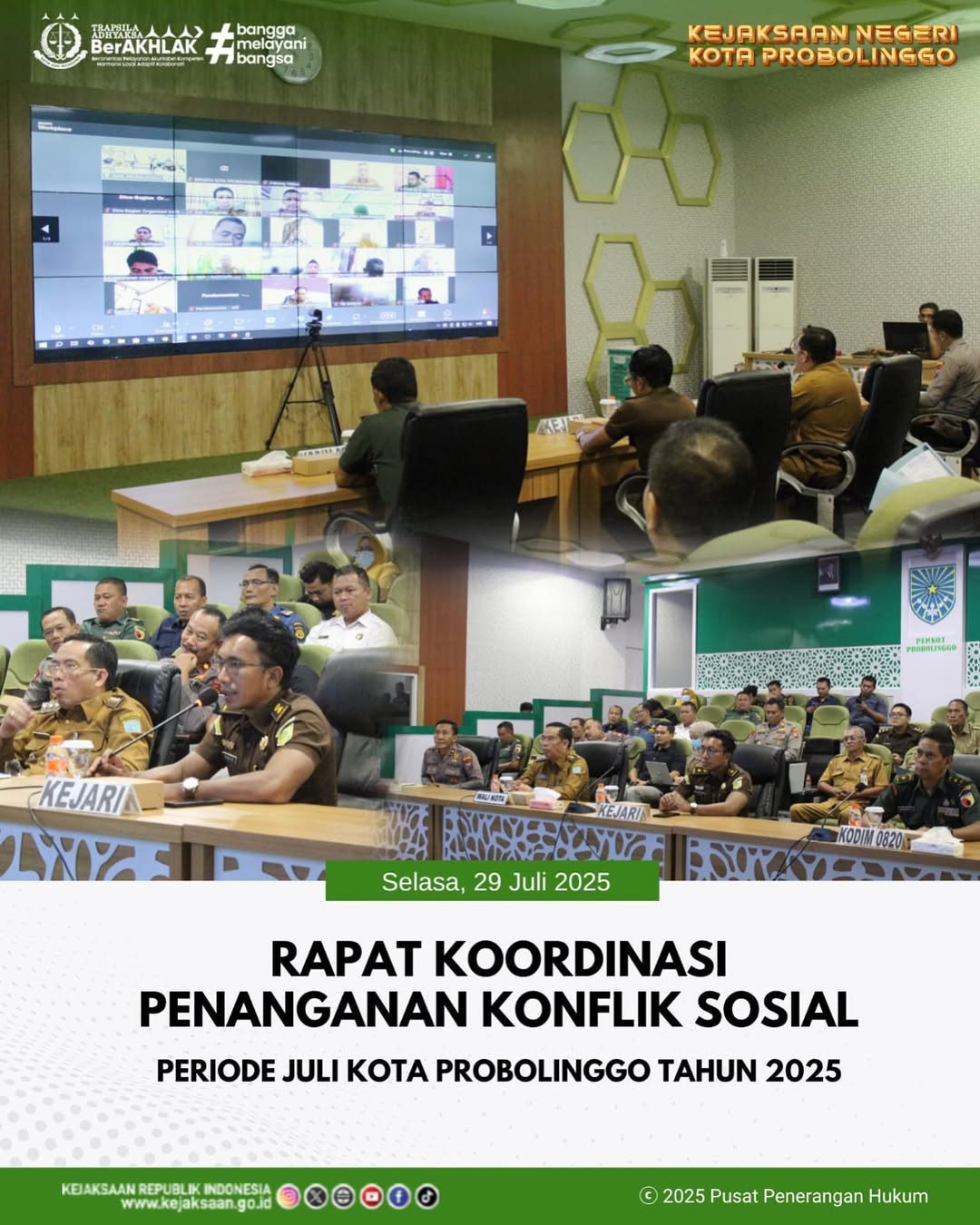 Bahwa pada hari Selasa, 29 Juli 2025, bertempat di Ruang Command Center Pemerintah Kota Probolinggo. Dodik Hermawan, S.H., M.H. Kepala Kejaksaan Negeri Kota Probolinggo yang dalam hal ini diwakili oleh Raden Bagus Eka Perwira, S.H., M.H., Kepala Seksi Tindak Pidana Umum, Andi Haeruddin Malik, S.H., M.H. Kepala Seksi Perdata dan Tata Usaha Negara beserta Staf Intelijen Kejaksaan Negeri Kota Probolinggo telah mengikuti kegiatan Rapat Koordinasi Penanganan Konflik Sosial Periode Bulan Juli Tahun 2025.