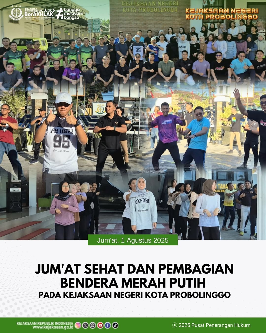 Pada hari Jumat, tanggal 1 Agustus 2025 pukul 07.00 s/d Selesai, bertempat di Halaman Kantor Kejaksaan Negeri Kota Probolinggo. Kepala Kejaksaan Negeri Kota Probolinggo, Dodik Hermawan, S.H., M.H. telah melaksanakan Kegiatan Olahraga Senam Pagi dan Pembagian Bendera Merah Putih yang diikuti oleh para Kasi, Jaksa Fungsional, Pegawai Struktural, dan Staf.