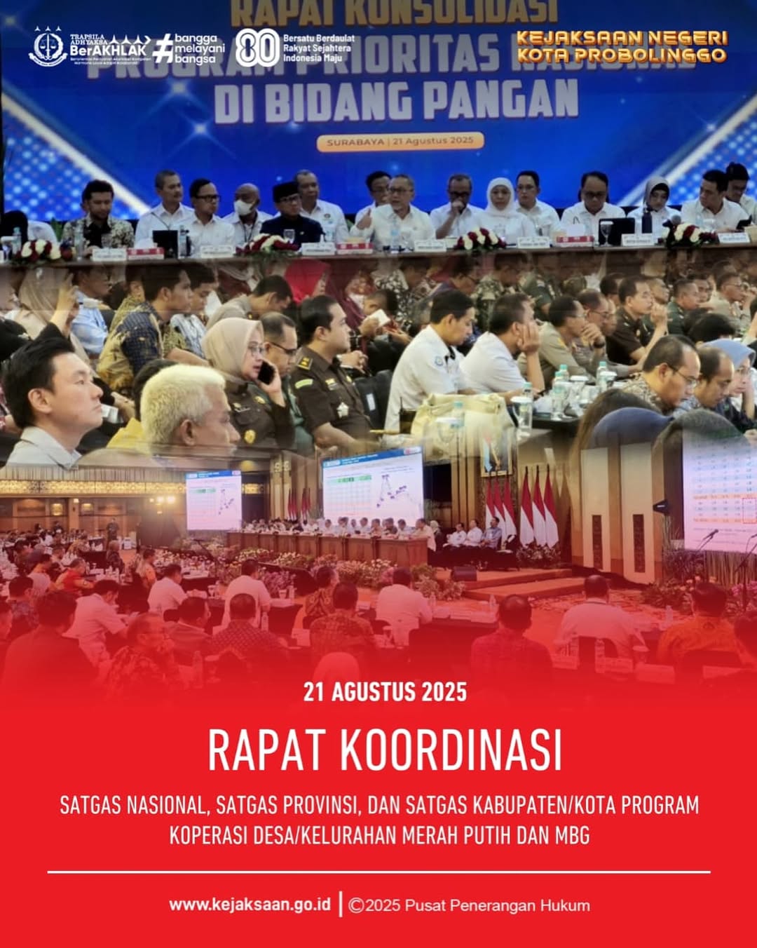Pada hari Kamis, tanggal 21 Agustus 2025, pukul 13.30 WIB s/d selesai, bertempat di Ruang Rapat Hayam Wuruk, Lantai 8, Setda. Provinsi Jawa Timur, Jalan Pahlawan No. 110, Surabaya. Dodik Hermawan, S.H., M.H. Kepala Kejaksaan Negeri Kota Probolinggo yang dalam hal ini diwakili oleh Herdiawan Prayudhi, S.H. Kepala Seksi Intelijen Kejaksaan Negeri Kota Probolinggo telah mengikuti kegiatan Rapat Koordinasi Satgas Nasional, Satgas Provinsi, dan Satgas Kabupaten/Kota Program Koperasi Desa/Kelurahan Merah Putih dan MBG.