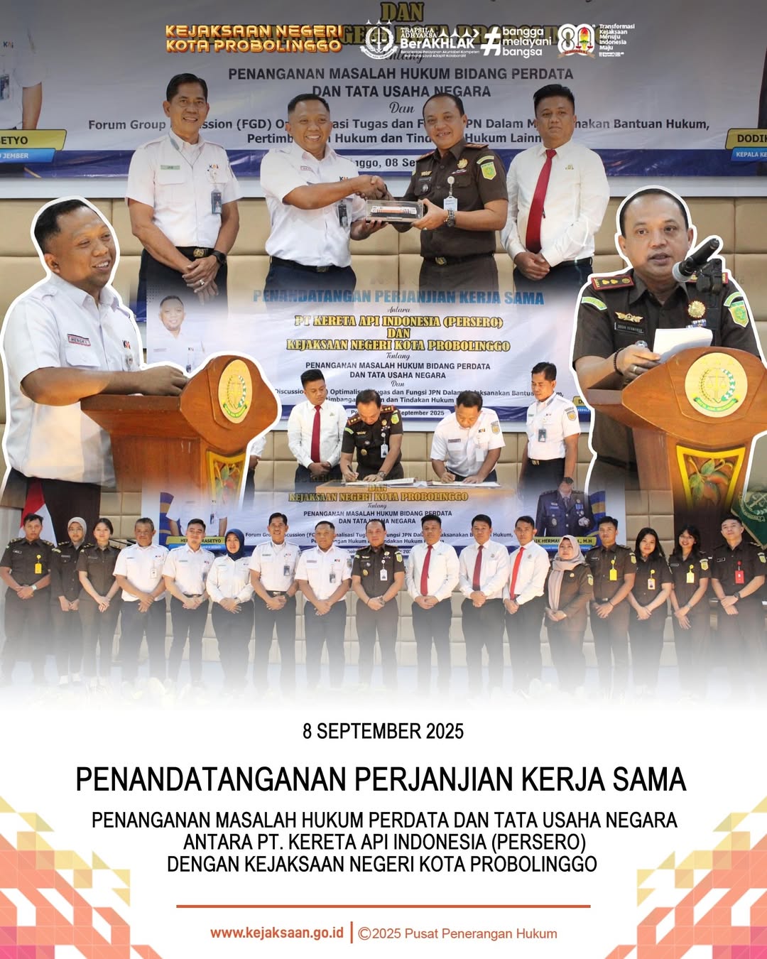 Pada hari Senin, tanggal 8 September 2025, pukul 14.15 WIB s/d 15.00 WIB, bertempat di Aula Kejaksaan Negeri Kota Probolinggo. Dodik Hermawan, S.H., M.H. Kepala Kejaksaan Negeri Kota Probolinggo didampingi oleh Andi Haeruddin Malik, S.H., M.H. Kepala Seksi Perdata dan Tata Usaha Negara beserta Staff bidang Perdata dan Tata Usaha Negara Kejaksaan Negeri Kota Probolinggo telah melaksanakan Kegiatan Penandatanganan Perjanjian Kerja Sama Bidang Perdata dan Tata Usaha Negara Antara PT. Kereta Api Indonesia (PERSERO) dengan Kejaksaan Negeri Kota Probolinggo Tentang Penanganan Masalah Hukum Bidang Perdata dan Tata Usaha Negara Dan Forum Group Discussion (FGD) Optimalisasi Tugas dan Fungsi JPN Dalam Melaksanakan Bantuan Hukum, Pertimbangan Hukum dan Tindakan Hukum Lainnya.