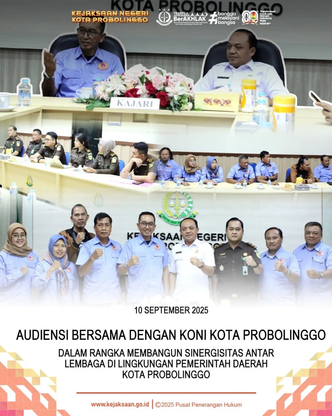 Pada hari Rabu, tanggal 10 September 2025, pukul 10.00 WIB s.d selesai bertempat di Aula Kejaksaan Negeri Kota Probolinggo. Dodik Hermawan, S.H., M.H. Kepala Kejaksaan Negeri Kota Probolinggo didampingi oleh Herdiawan Prayudhi, S.H. Kepala Seksi Intelijen beserta Staff Intelijen Kejaksaan Negeri Kota Probolinggo telah melaksanakan Kegiatan Audiensi Bersama dengan KONI Kota Probolinggo dalam rangka Membangun Sinergisitas Antar Lembaga di Lingkungan Pemerintah Daerah Kota Probolinggo, khususnya dengan Forum Komunikasi Pimpinan Daerah (Forkopimda).