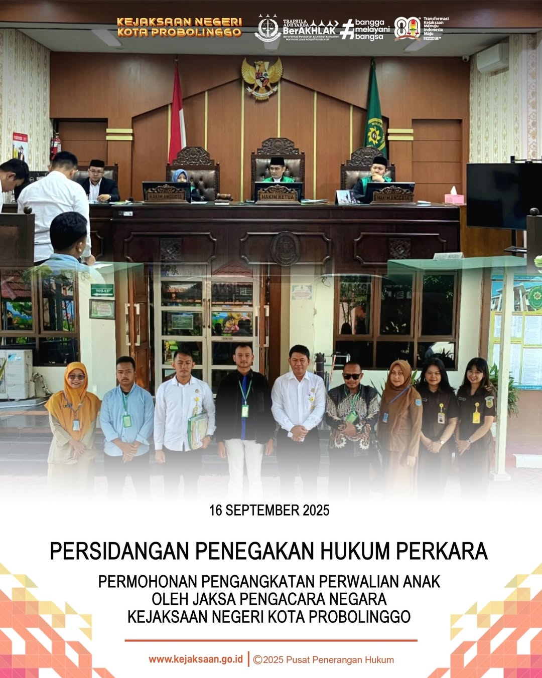Pada hari Selasa tanggal 16 September 2025, Bertempat di Pengadilan Agama Probolinggo, Jl. Raya Bromo No. KM. 7, Kec. Kademangan, Kota Probolinggo, Andi Haeruddin Malik, S.H., M.H. Kepala Seksi Perdata dan Tata Usaha Negara beserta Kasubsi dan Staff Bidang Perdata dan Tata Usaha Negara Kejaksaan Negeri Kota Probolinggo telah melaksanakan Persidangan Penegakan Hukum Perkara Permohonan Pengangkatan Perwalian Terhadap 2 Anak tanggal 15 September 2025 oleh Jaksa Pengacara Negara Kejaksaan Negeri Kota Probolinggo pada Pengadilan Agama Probolinggo.