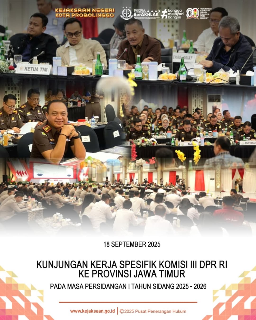 Pada hari Kamis, 18 September 2025, pukul 08.30 WIB s/d selesai, bertempat di Mapolda Jawa Timur, Jl. Ahmad Yani No.116, Kec. Wonocolo, Surabaya. Dodik Hermawan, S.H., M.H. Kepala Kejaksaan Negeri Kota Probolinggo telah menghadiri Kegiatan Kunjungan Kerja Spesifik Komisi III DPR RI ke Provinsi Jawa Timur pada Masa Persidangan I Tahun Sidang 2025 – 2026.