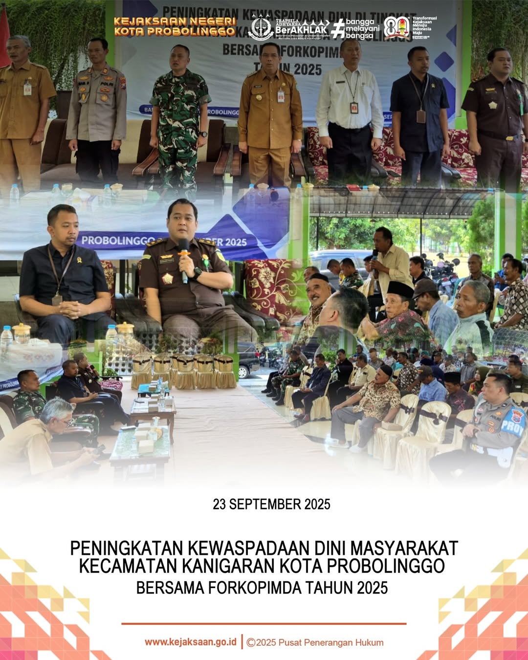 Pada hari Selasa, tanggal 23 September 2025 pukul 09.30 WIB s/d 11.20 WIB, bertempat di Kecamatan Kanigaran, Kota Probolinggo. Dodik Hermawan, S.H., M.H. Kepala Kejaksaan Negeri Kota Probolinggo yang dalam hal ini diwakili oleh Herdiawan Prayudhi, S.H. Kepala Seksi Intelijen Kejaksaan Negeri Kota Probolinggo telah menghadiri kegiatan Peningkatan Kewaspadaan Dini Masyarakat Kecamatan Kanigaran Kota Probolinggo bersama Forkopimda Tahun 2025.