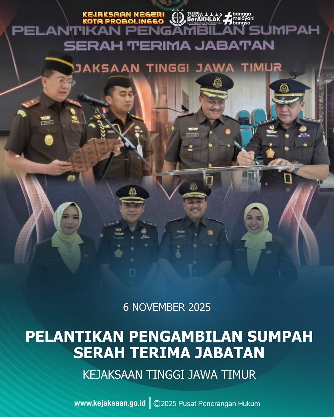 Pada hari Kamis, tanggal 06November 2025, pukul 07.30 WIB s/d 10.00 WIB, telah dilaksanakan kegiatan Pelantikan Pengambilan Sumpah Serah Terima Jabatan Kepala Kejaksaan Negeri Kota Probolinggo dari pejabat lama Dodik Hermawan, S.H., M.H. kepada pejabat baru Lilik Setiyawan, S.H., M.H. yang dilaksanakan di Aula Kejaksaan