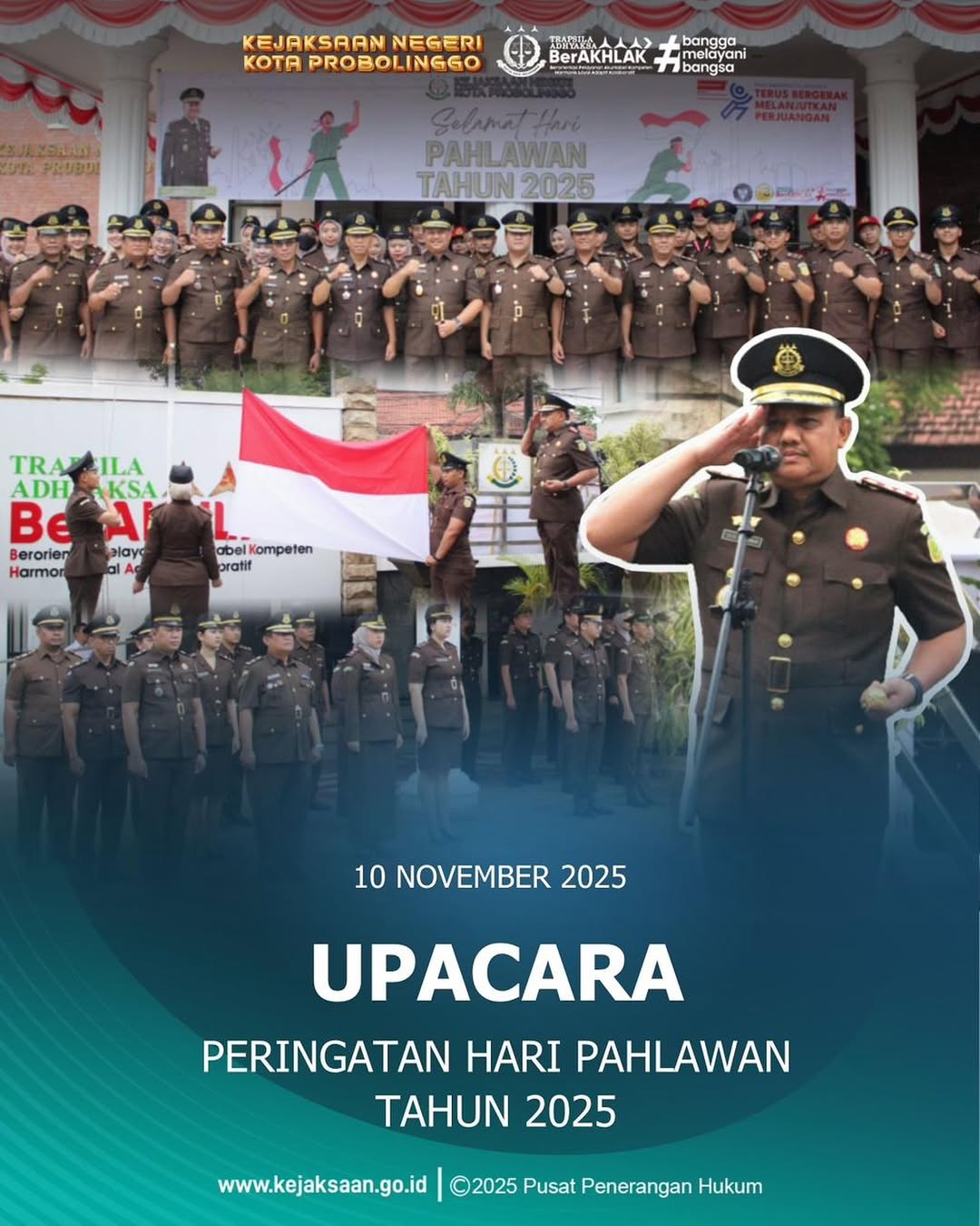 Pada hari Senin tanggal 10 November 2025 pukul 07.30 WIB s/ d Selesai, bertempat di Halaman Kantor Kejaksaan Negeri Kota Probolinggo, Lilik Setiyawan, S.H., M.H. Kepala Kejaksaan Negeri Kota Probolinggo, selaku penerima Upacara telah melaksanakan Kegiatan Upacara Peringatan Hari Pahlawan dengan Tema “Pahlawanku Teladanku Terus Bergerak Melanjutkan Perjuangan” diikuti oleh seluruh pegawai pada Kejaksaan Negeri Kota Probolinggo.