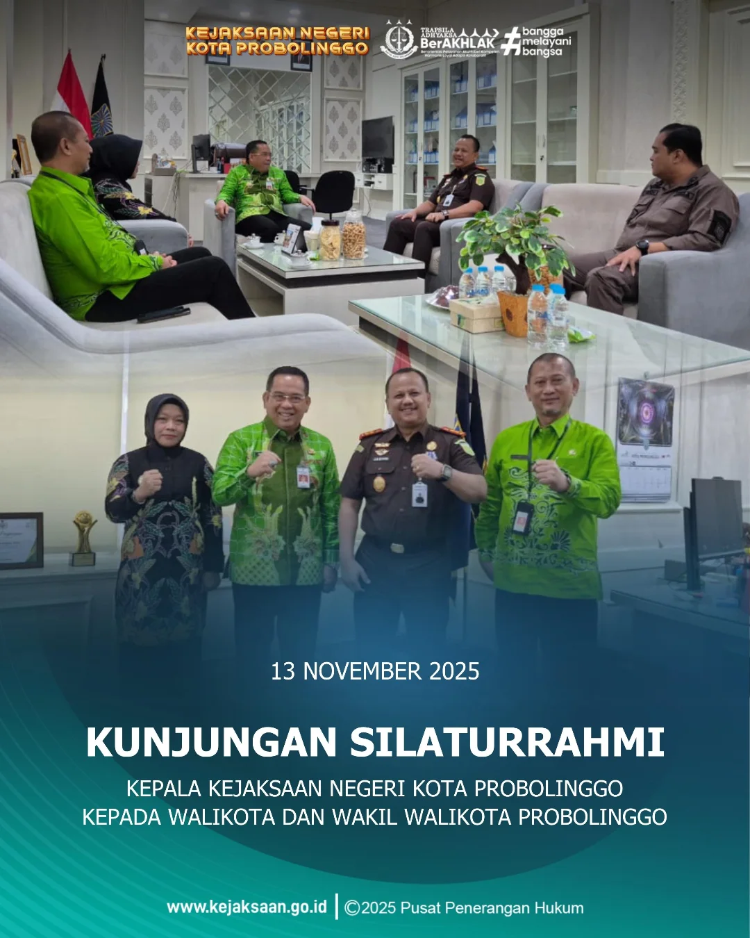 Pada hari Kamis, tanggal 13 November 2025 pukul 08.00 WIB s/d selesai, bertempat di Kantor Pemerintah Kota Probolinggo, Lilik Setiawan, SH., MH Kepala Kejaksaan Negeri Kota Probolinggo melaksanakan kegiatan Kunjungan Silaturrahmi kepada Walikota dan Wakil Walikota Probolinggo.