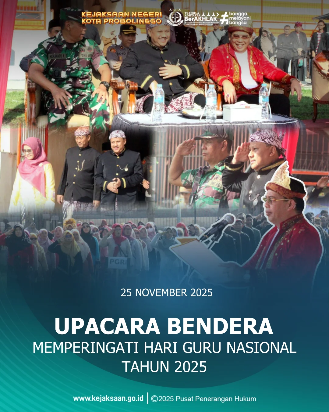 Pada hari Selasa, tanggal 25 November 2025, pukul 07.20 WIB s/d 08.20 WIB, bertempat di Stadion Bayuangga, Jln. Kaca Piring Kel. Sukabumi Kec. Mayangan Kota Probolinggo. Lilik Setiyawan, S.H., M.H. Kepala Kejaksaan Negeri Kota Probolinggo telah melaksanakan kegiatan Upacara Bendera Memperingati Hari Guru Nasional Tahun 2025 oleh Pemerintah Kota Probolinggo.