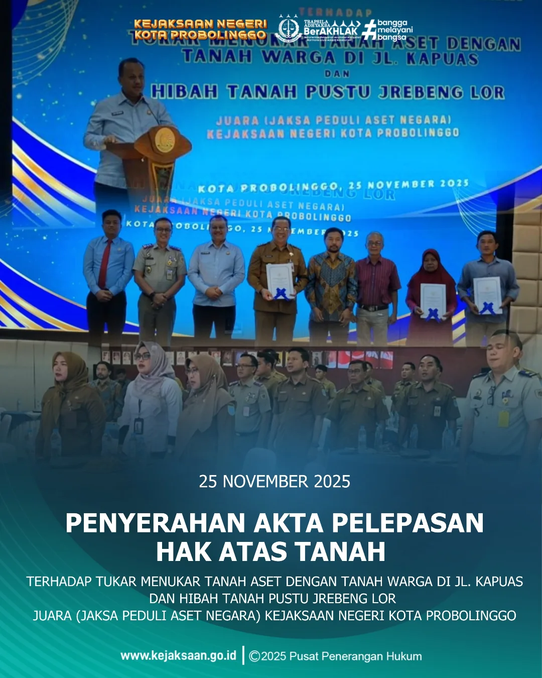 Pada hari Selasa, tanggal 25 November 2025, pukul 13.00 WIB s/d selesai, bertempat di Aula Kejaksaan Negeri Kota Probolinggo. Lilik Setiyawan, S.H., M.H. Kepala Kejaksaan Negeri Kota Probolinggo didampingi oleh Andi Haeruddin Malik, S.H., M.H. Kepala Seksi Perdata dan Tata Usaha Negara Kejaksaan Negeri Kota Probolinggo telah melaksanakan Kegiatan Penyerahan Akta Pelepasan Hak Atas Tanah terhadap Tukar Menukar Tanah Aset dengan Tanah Warga di Jl. Kapuas dan Hibah Tanah Pustu Jrebeng Lor.