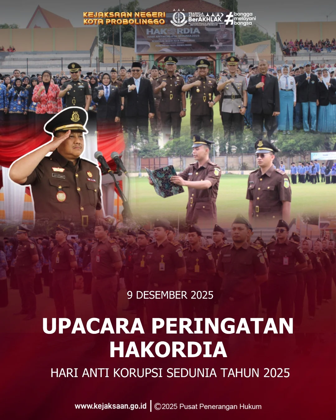 Pada hari Selasa tanggal 9 Desember 2025 pukul 07.00 WIB s/ d selesai bertempat di Stadion Bayuangga Kota Probolinggo telah dilaksanakan Upacara Peringatan Hari Anti Korupsi Sedunia di Kota Probolinggo dengan Bapak Lilik Setiyawan, S.H., M.H. Kepala Kejaksaan Negeri Kota Probolinggo bertindak sebagai Inspektur Upacara. Kegiatan Upacara Peringatan Hari Anti Korupsi Sedunia Tahun 2025 diikuti oleh Jajaran Forkopimda Kota Probolinggo, seluruh Pegawai Kejaksaan Negeri Kota Probolinggo, para pimpinan OPD se-Kota Probolinggo beserta Perwakilan siswa dan siswi dari tingkat SMP-SMA se-Kota Probolinggo.