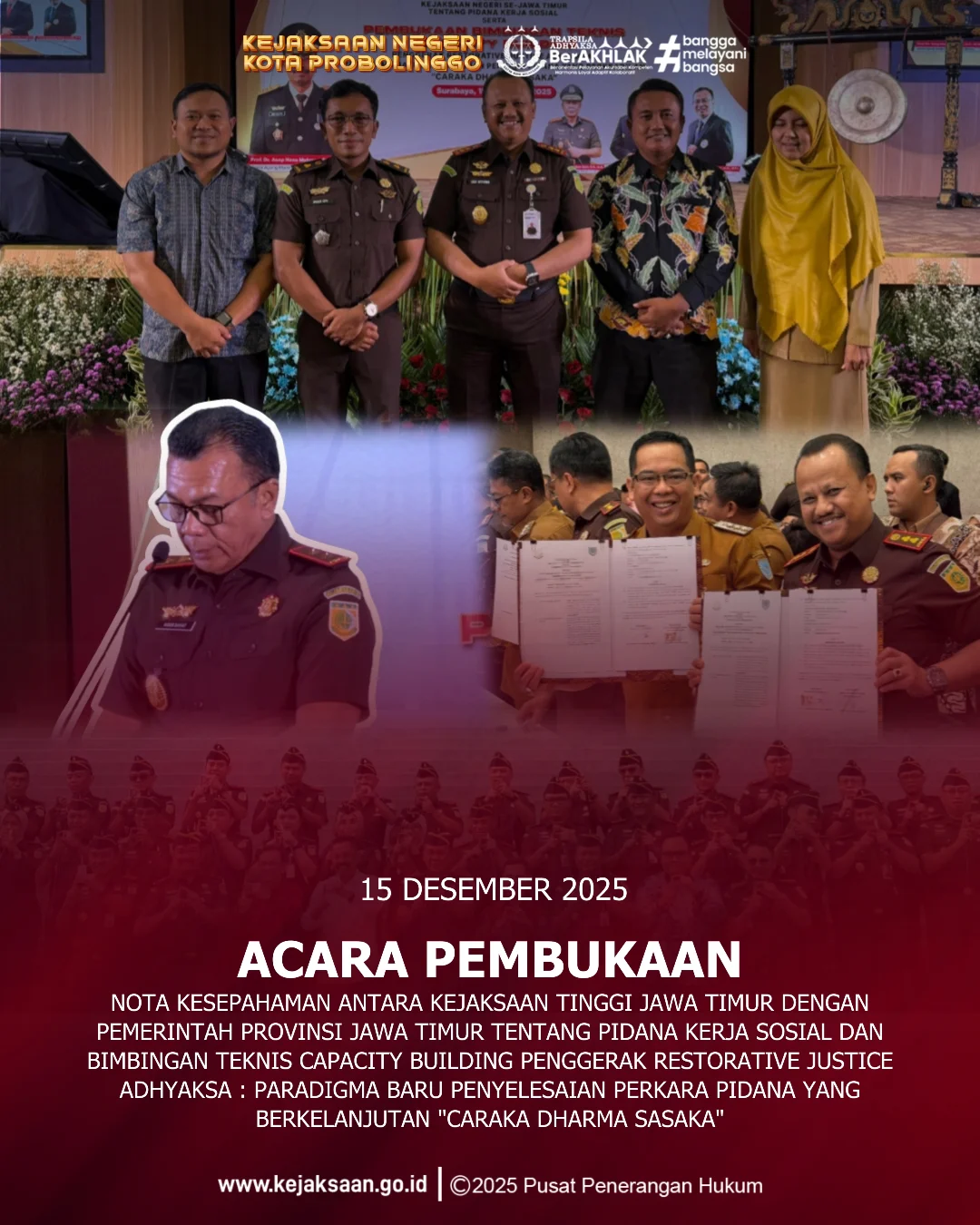 Pada hari Senin, tanggal 15 Desember 2025 pukul 08.30 WIB s/d selesai, bertempat di Aula Fakultas Hukum Universitas Airlangga. Lilik Setiyawan, S.H., M.H. Kepala Kejaksaan Negeri Kota Probolinggo telah menghadiri kegiatan Acara Pembukaan Nota Kesepahaman Antara Kejaksaan Tinggi Jawa Timur dengan Pemerintah Provinsi Jawa Timur tentang Pidana Kerja Sosial dan Bimbingan Teknis Capacity Building Penggerak Restorative Justice Adhyaksa : Paradigma Baru Penyelesaian Perkara Pidana yang Berkelanjutan “Caraka Dharma Sasaka”.
